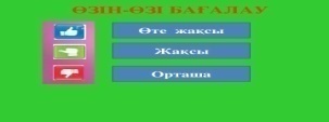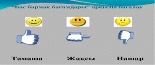 Мұғалім оқушыларды «Бас бармақ» әдісі арқылы бағалайды. Жарайсың! Жақсы! Талпын! |