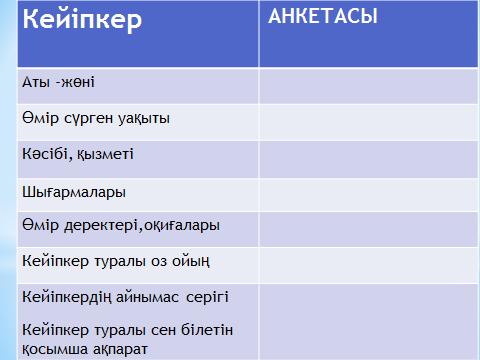3-тапсырма «Кейіпкер анкетасы» әдісімен кейіпкерге талдау жасаңдар.