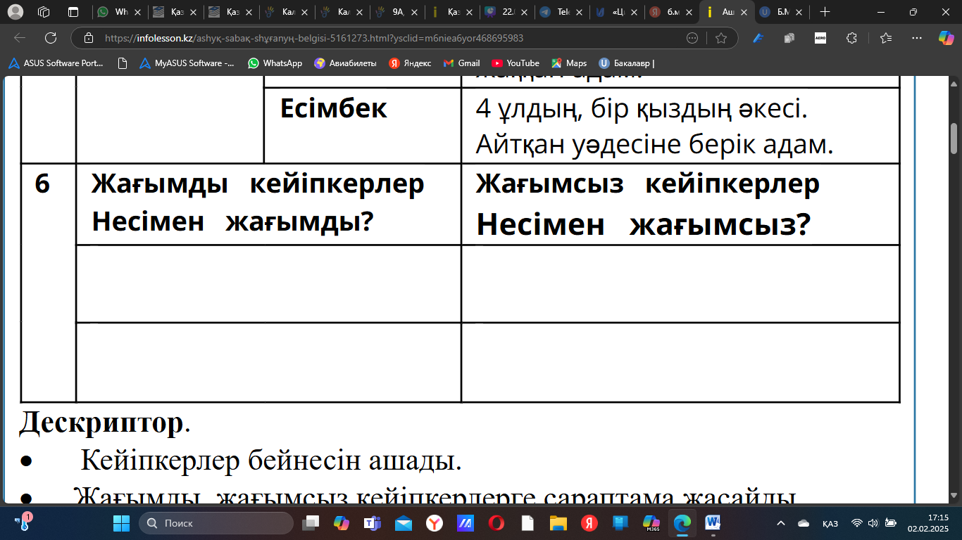 Дескриптор: *талдау жасайды 2 балл Дескриптор: *кейіпкердің іс-әрекетін бағалайды 2 балл Дескриптор: *кейіпкерге талдау жасайды 2 балл Дескриптор: *кейіпкерге сұрақ қояды *кейіпкер ретінде жауап береді 2 балл |