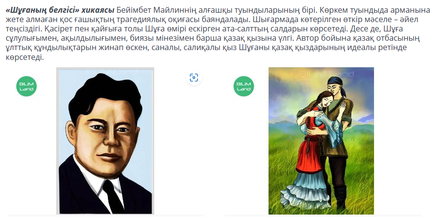 әкелемін. 1.Махаббат деген не ? 2.Махаббаттың қандай түрлері бар? 3. Қос ғашықтарды ата. - Сонымен бүгінгі сабағымыздың тақырыбы-Бейімбет Майлиннің «Шұғаның белгісі» хикаяты