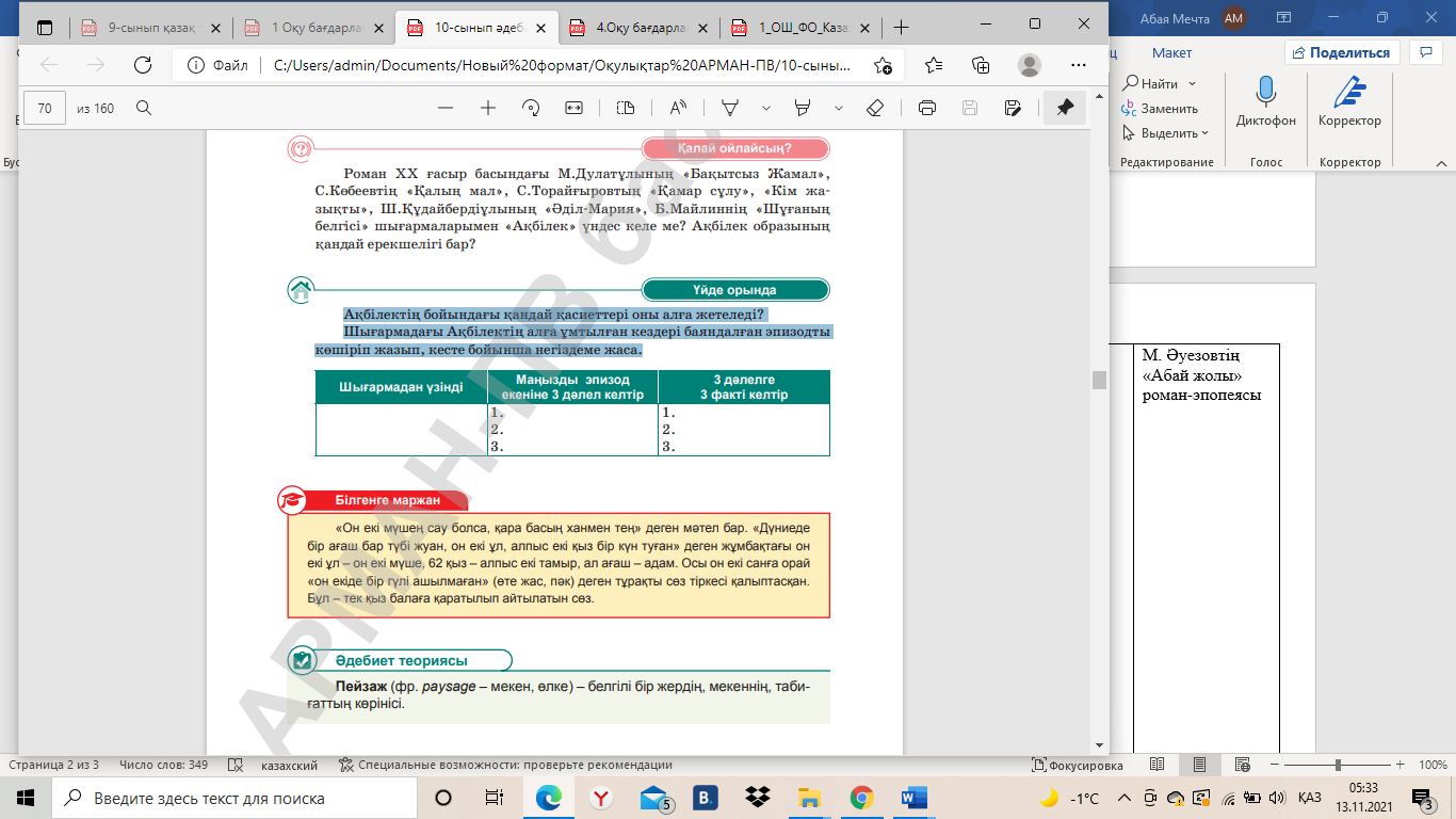 Оқушылар шығармадағы Ақбілектің алға ұмтылған кездері баяндалған эпизодты анықтайды; Маңызды эпизод екенінен 3 дәлел келтіреді; 3 дәлелге 3 факті келтіреді; Ойын дәлелдейді. «Ақбілек» романына байланысты жазылған пікірді талқылайды. Берілген пікірді негізге алады; идеясы ұқсас шығармалар табады; өзара салыстыру жүргізеді; әдеби сын жазады. «Автор орындығында» өз жұмыстарын оқиды. |