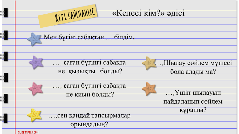 Сыныпты түгелдеу «Ауа райы» таяқшаларын көтереді. Өлең шумағын хормен орындайды,сәт тілік тілейді Өткен тақырыптарға «Келесі кім?» әдісі арқылы тізбектелген сұрақтар қояды Мәтінді рөлмен оқиды Сөйлемдерді көшіріп жазады Мәтелді жазады Тест сұрақтарына жауап береді Үй тапсырмасын алады Кері байланыс жасайды |