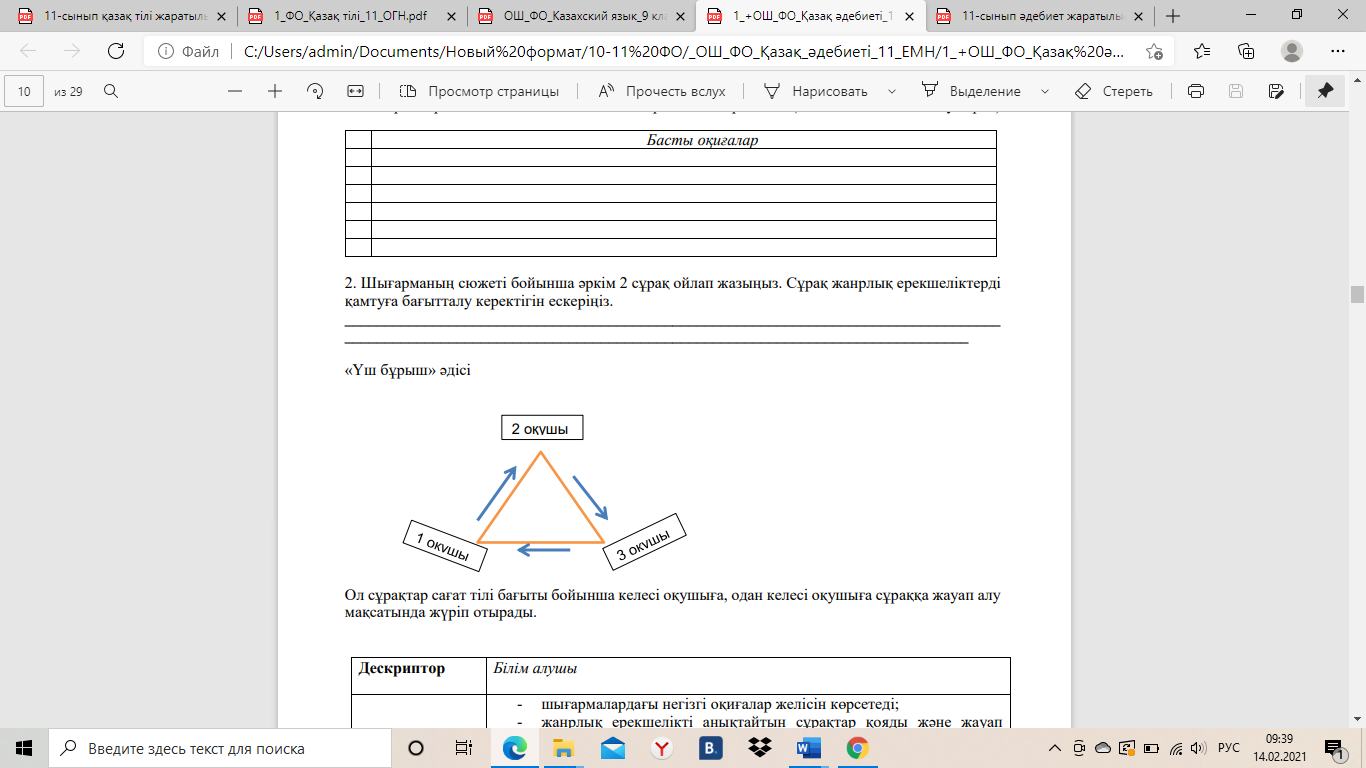 2. Шығарманың сюжеті бойынша әркім 2 сұрақ ойлап жазыңыз. Сұрақ жанрлық ерекшеліктерді қамтуға бағытталу керектігін ескеріңіз. ____________________________________________________________________________________________________ «Үш бұрыш» әдісі