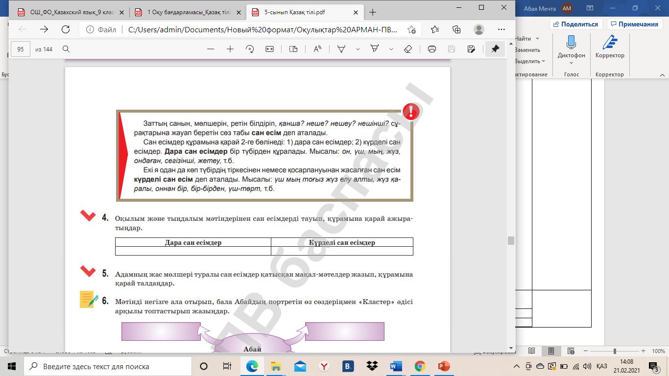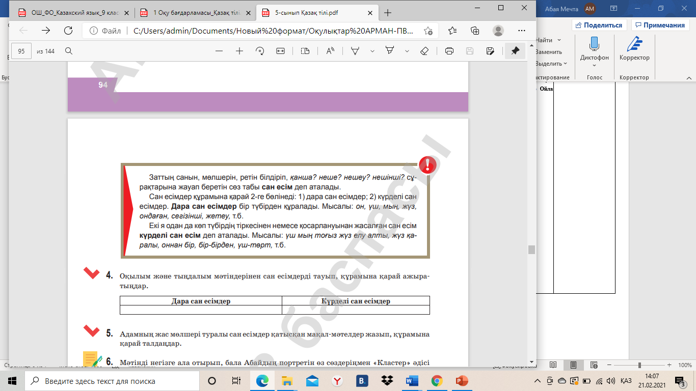 5.1.4.1 тірек сөздер мен жетекші сұрақтар арқылы негізгі ойды анықтау; 5.4.4.4 сан есімнің мағыналық түрлерін ажырата білу, сан есімді зат есім орнына қолдана білу. |