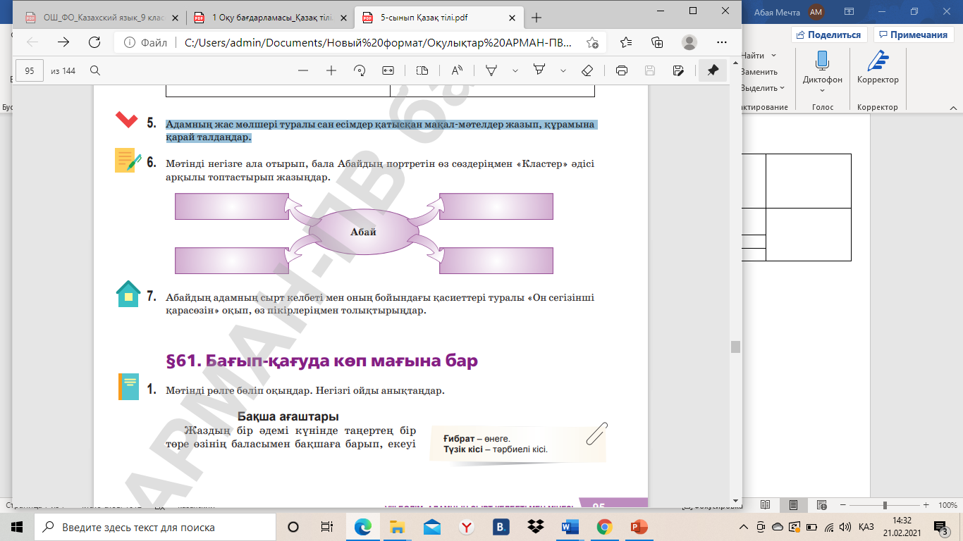 Мәтінді негізге ала отырып, бала Абайдың портретін өз сөздеріңмен «Кластер» әдісі арқылы топтастырып жазыңдар. |