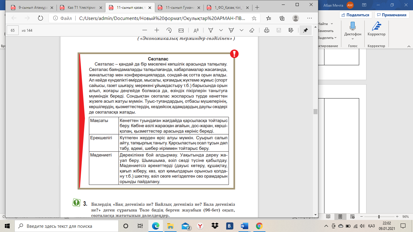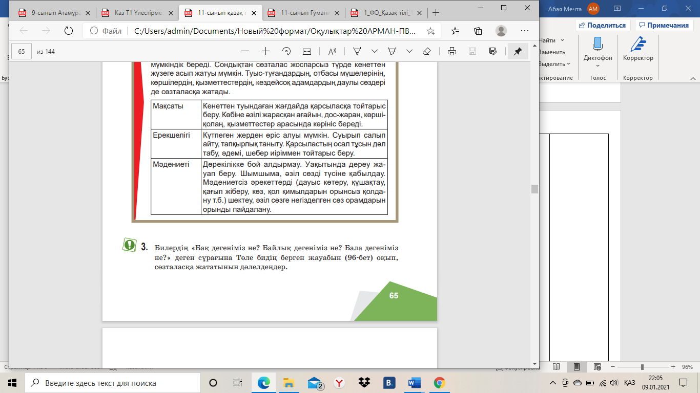 11.1.2.1 - мамандандырылған тар аядағы арнайы мəтіндердегі (интервью, мақала) мақсатты аудиторияға арналған терминдер мен ұғымдарды, тілдік оралымдарды, мəтін үзінділерін талдау; 11.3.6.1 - жазба жұмысын абзац пен бөліктерге бөлу, ойын (ақпарат, идея) дұрыс жүйелеп, логикалық жəне стильдік түзетулер енгізу, редакциялау). 11.4.2.1 - сөйлеу ағымындағы интонацияның құрамдас бөліктері: əуен, əуез, тембр, қарқын, кідірісті сөйлеу мəнеріне сай қолдану; |