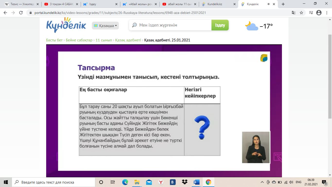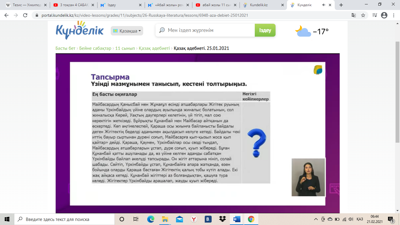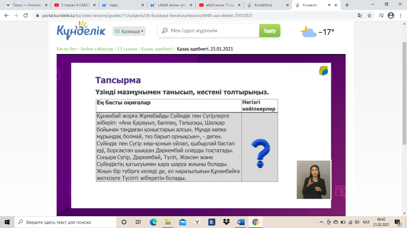 1.Ұйымдастыру кезеңі. Жағымды психологиялық ахуал қалыптастыру. Қызығушылығын ояту. Үзінді мазмұнымен танысып, ондағы кейіпкерлерді анықтаңыздар. 1-үзінді