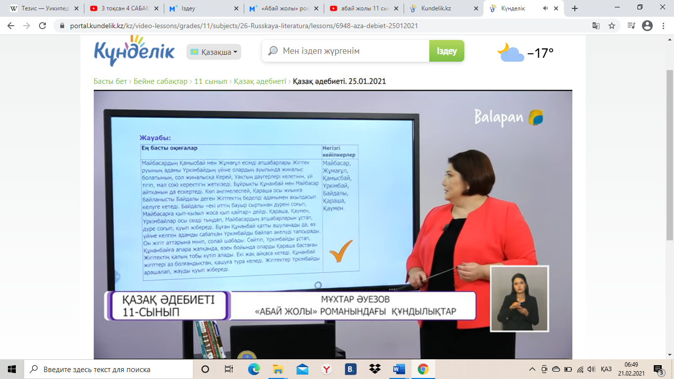 Барлық оқушылар: «Абай жолы» роман- эпопеясындағы үзінділерді тапсырмалар орындау барысында орынды қолдану; Көпшілігі: өз көзқарасын дәлелдеу үшін әңгіме үзінділерін орынды қолданып, ғаламдық тақырыптағы өзекті мәселелермен байланыстыру, автор бейнесін анықтау; Кейбір оқушылар: көркем шығармалардан алған үзінділерді ғаламдық тақырыптағы өзекті мәселелермен байланыстырып, шығармашылық жұмыстарда қолдану, автор бейнесінің шығарманың негізгі идеясымен байланысын айқындау. |