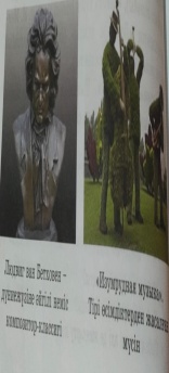 1-тапсырма. Əңгімелеу. Талдау. Сабақтың тақырыбын ашу үшін оқушыларға түрлі мүсіндердің суреттерін көрсетеді. Ғаламтор желісін де пайдалануға болады. Сыныпта мүсіндерге байланысты əңгіме жүргізу қажет. М. Бейнетаспадан көрген мүсіндерді сыныпта талдау. – Мүсіндер түрлеріне назар аудару жəне келесі сұраққа жауап беру: – Мүсіндер қандай көңіл күйді білдіреді? 2-тапсырма. Ақпарат іздеу. Сабақта мүсін туралы ақпарат беру жəне музыкалық терминдерге түсініктеме дайындау қажет. Алдын ала оқушыларға мына сұрақтарды бергені жөн: – Мүсін дегеніміз не? – Мүсіндердің қандай түрлері бар? – Олар неден жасалады? – Сөзжұмбақты шеш. Оқулықпен жұмыс: «Мүсіннің сыры» сөзжұмбағы (сурет)..Оқушылар оқулықта берілген «Мүсіннің сыры» сөзжұмбағын шешеді. Сұрақтар мен жауаптар: 3-тапсырма. Талдау. . Бір жағында музыка өнерінің туындылары – музыканың өзі, оны жазатын жəне ойнайтын музыканттар, музыкалық аспаптар т.б. Тапсырма: cуреттерді зерттеу, талдау жасау, сұрақтарға жауап беру, пікірін айту. Оқулықпен жұмыс 4-5-тапсырмаларды оқулықтан оқып тапсырмаларды орындау.. 6-тапсырма. Таныстырылым жəне бағалау. Сабақтың соңында оқушылардан өзара бағалауды жəне мына сұрақтарға жауап беруді сұрайды: М/О. Өзара бағалауды жүргіз. Мына сұрақтарға жауап бер: – Сабақта не сəтті шықты? – Қайсы тапсырма қиын болды? – Сабақта нені əлі де жақсарту қажет? |