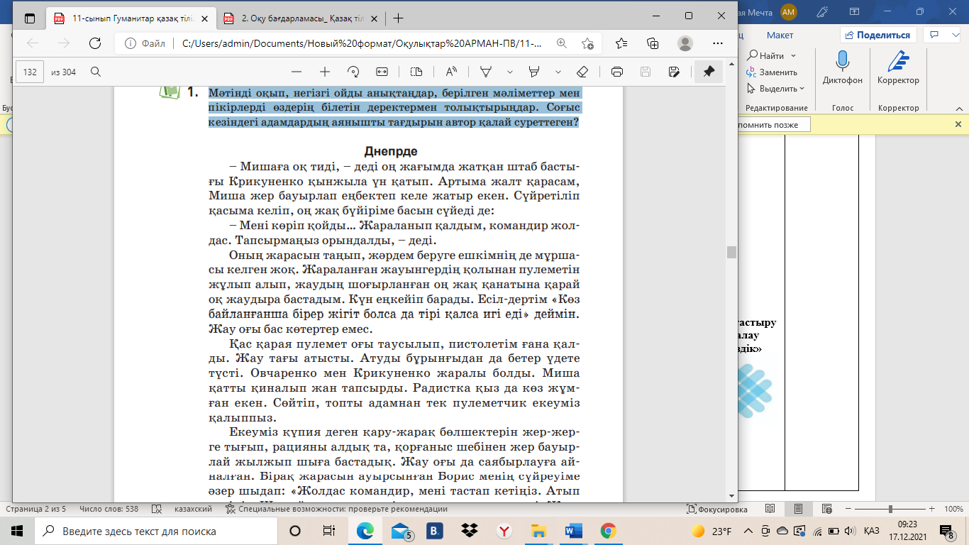 11.2.5.1 - мәтіндегі негізгі ойды анықтау, берілген мәліметтер мен пікірлерді өңдеу және толықтыру; 10.2.6.1 белгілі бір мақсат үшін оқылым стратегияларын жүйелі қолдана білу. |