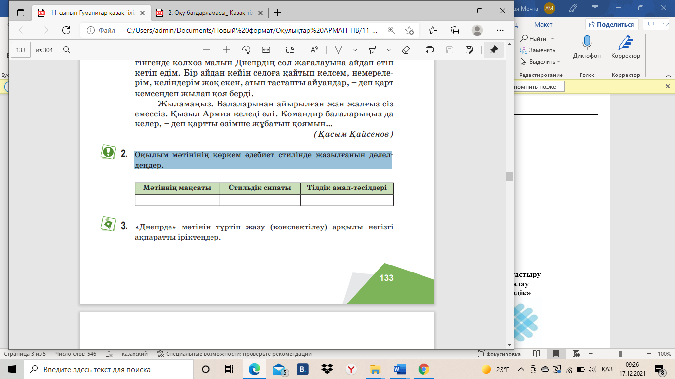 Оқылым мәтінінің көркем әдебиет стилінде жазылғанын анықтайды; Мәтіннің мақсатын анықтайды; Стильдік сипатын талдайды; Тілдік амал-тәсілдерін анықтайды; Ойларын дәлелдейді.