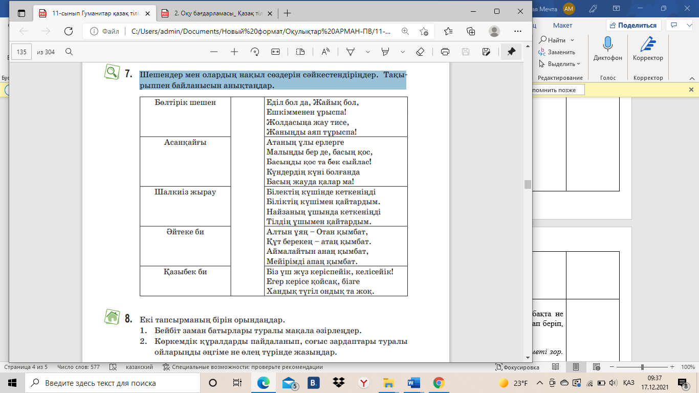 ҚБ Бекіту. Шешендер мен олардың нақыл сөздерін сәйкестендіріңдер. Тақырыппен байланысын анықтаңдар. Ойларыңды қорытындылаңдар.