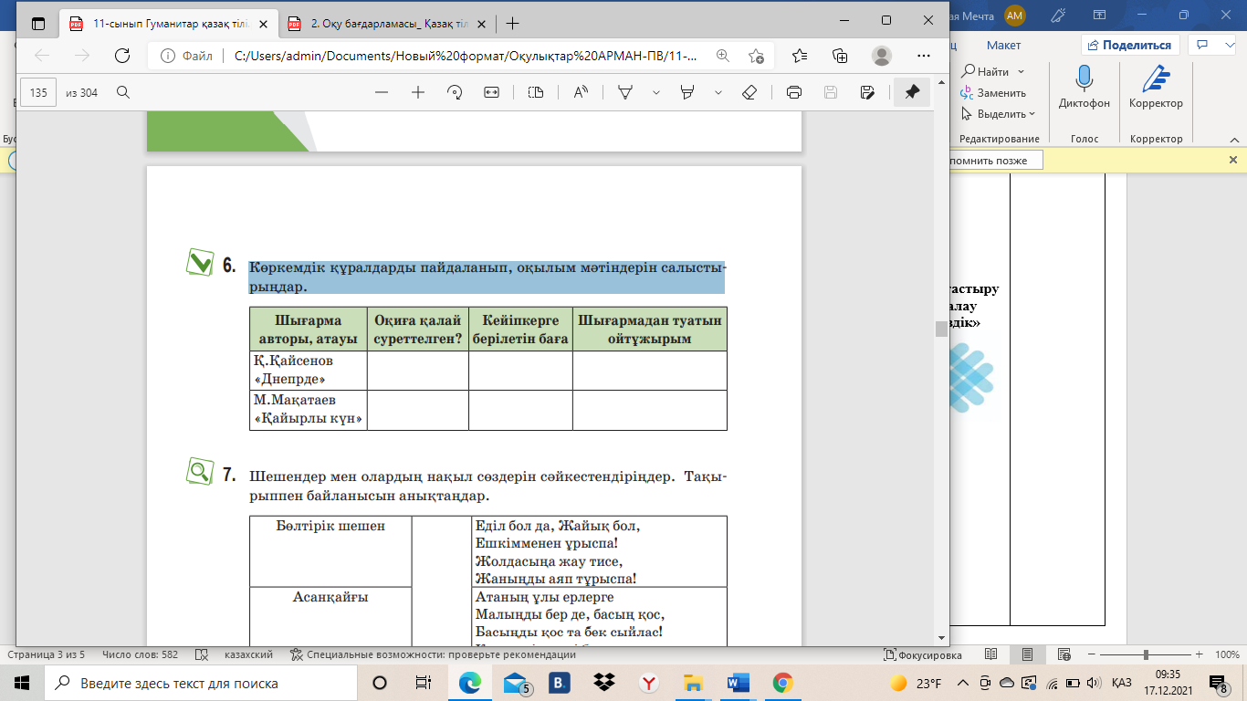 6-тапсырма. Көркемдік құралдарды пайдаланып, оқылым мәтіндерін салыстырыңдар.