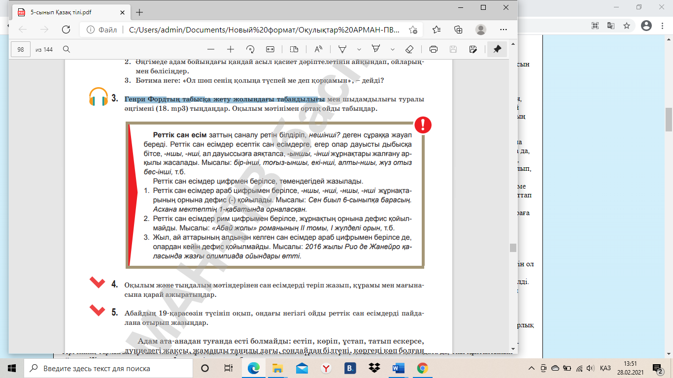 5.2.6.1. Оқылым стратегияларын қолдану: жалпы мазмұнын түсіну үшін оқу, нақты ақпаратты табу үшін оқу. 5.4.4.4 сан есімнің мағыналық түрлерін ажырата білу, сан есімді зат есім орнына қолдана білу. |