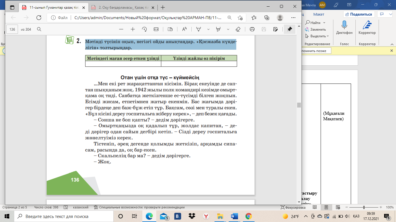 1.Мәтінді түсініп оқып, негізгі ойды анықтаңдар. «Қосжазба күнделігін» толтырыңдар.