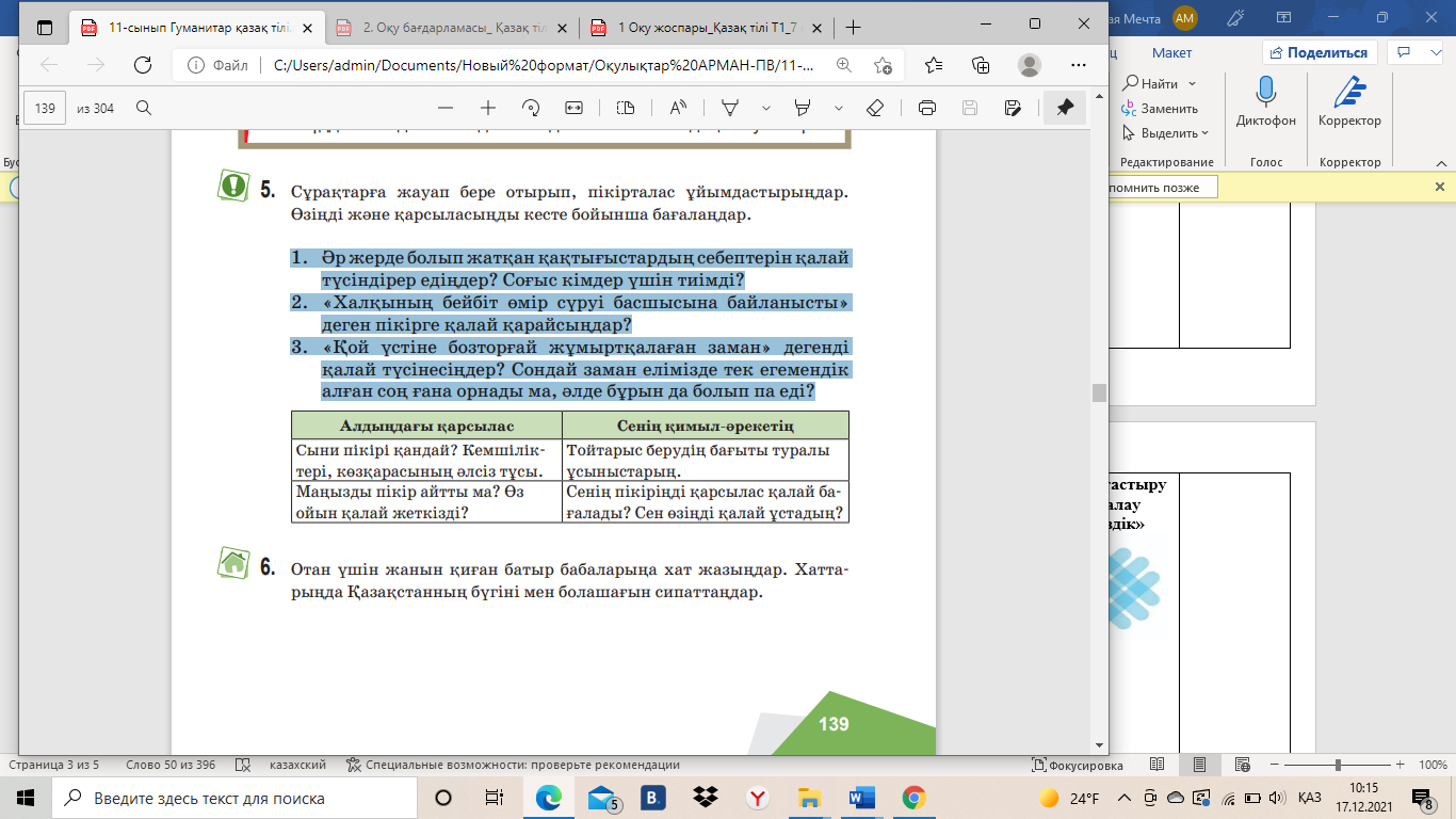5-тапсырма. Сұрақтарға жауап бере отырып, пікірталас ұйымдастырыңдар. Өзіңді және қарсыласыңды кесте бойынша бағалаңдар. 1. Әр жерде болып жатқан қақтығыстардың себептерін қалай түсіндірер едіңдер? Соғыс кімдер үшін тиімді? 2. «Халқының бейбіт өмір сүруі басшысына байланысты» деген пікірге қалай қарайсыңдар? 3. «Қой үстіне бозторғай жұмыртқалаған заман» дегенді қалай түсінесіңдер? Сондай заман елімізде тек егемендік алған соң ғана орнады ма, әлде бұрын да болып па еді?