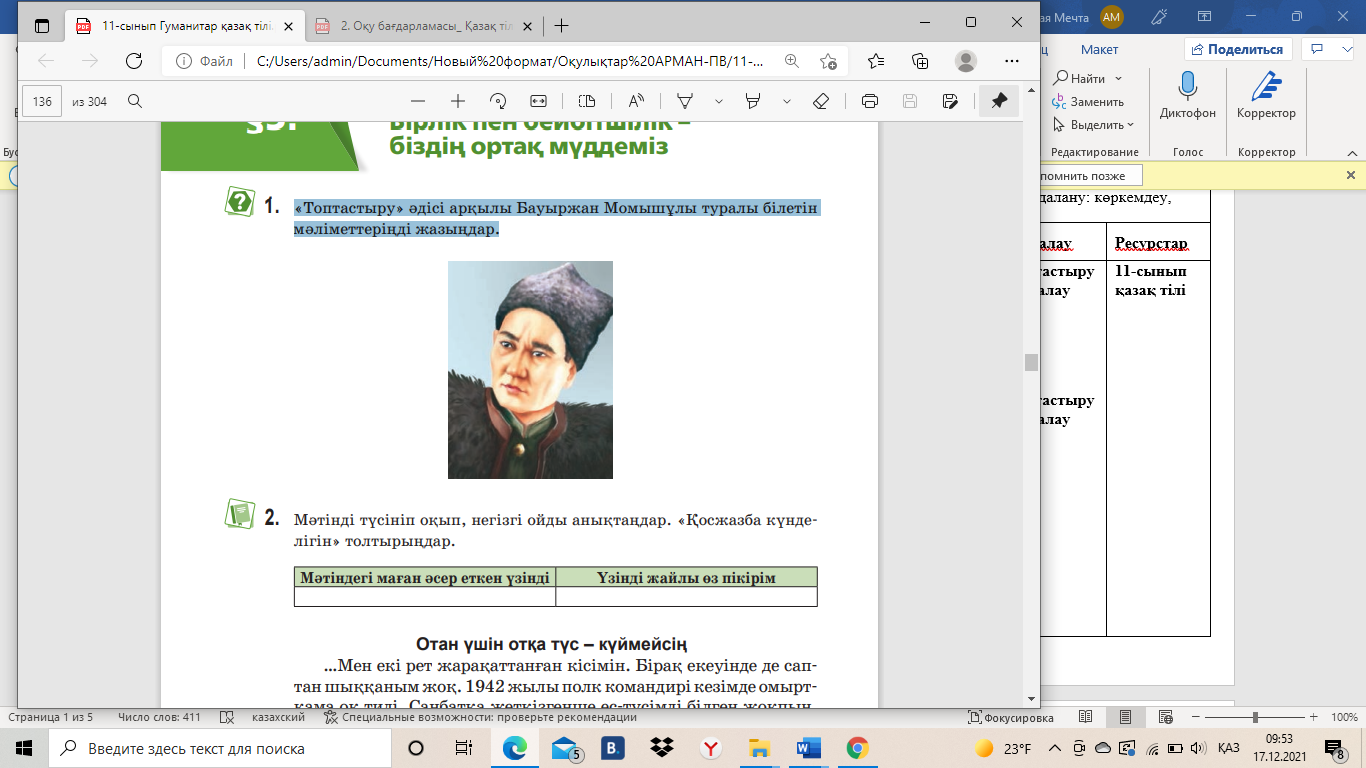 Оқушылар «Топтастыру» әдісі арқылы Бауыржан Момышұлы туралы білетін мәліметтерін жазады.
