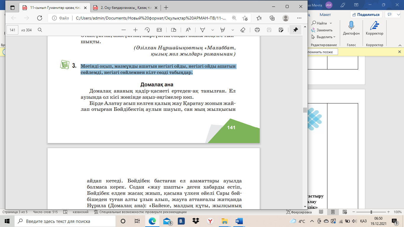 3-тапсырма. Мәтінді оқып, мазмұнды ашатын негізгі ойды, негізгі ойды ашатын сөйлемді, негізгі сөйлемнен кілт сөзді табыңдар.