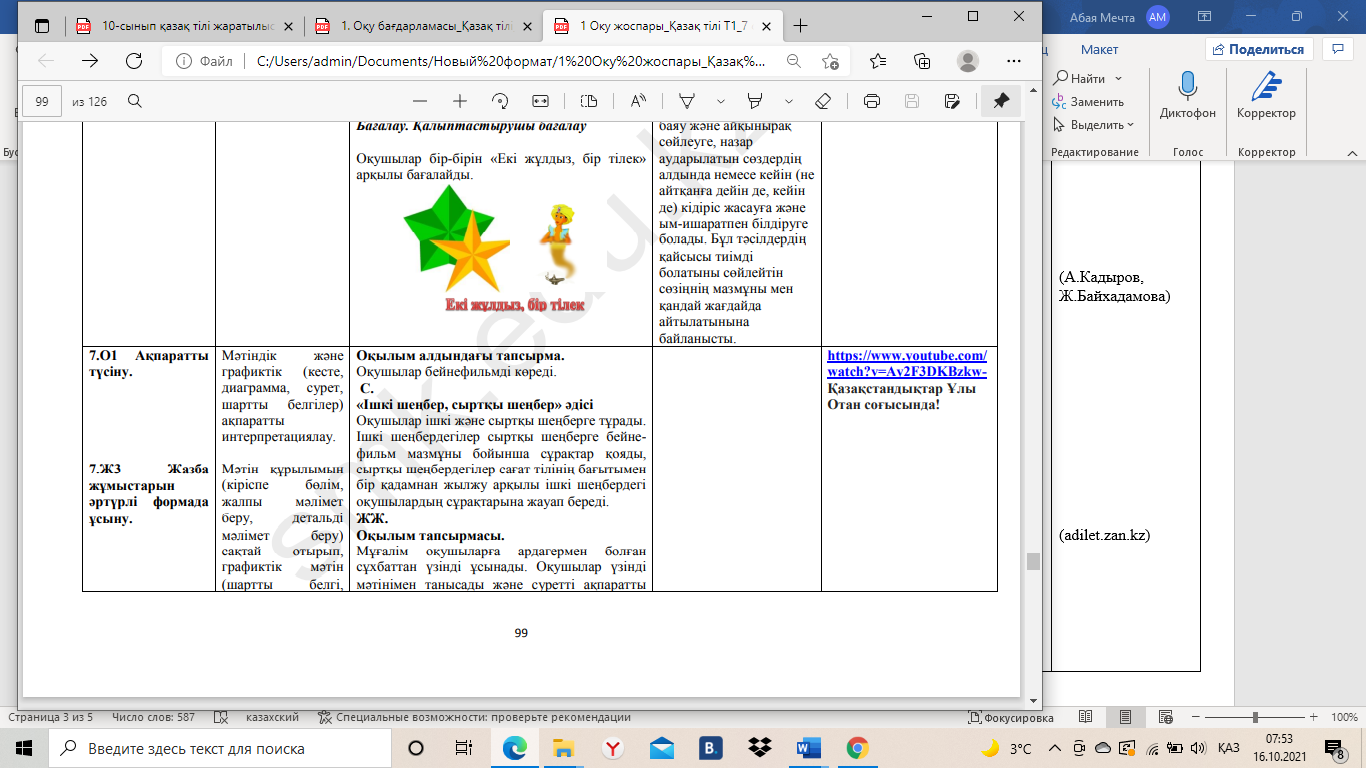 Оқушылар үш топқа бөлінеді. Мәтінді тыңдап, мәтіндегі көтерілген мәселе бойынша «Әткеншек» әдісімен суреттердегі ақпаратты қатыстырып, екі сұрақ құрастырады. Өз тобыңа келген сұрақтарға жауап береді. Мәтінді оқып, өткен сабақтағы оқылым мәтінімен салыстыра талдайды. Стилін анықтайды. Оқушылар ішкі және сыртқы шеңберге тұрады. Ішкі шеңбердегілер сыртқы шеңберге бүгінгі тақырып бойынша сұрақтар қояды, сыртқы шеңбердегілер сағат тілінің бағытымен бір қадамнан жылжу арқылы ішкі шеңбердегі оқушылардың сұрақтарына жауап береді. |
