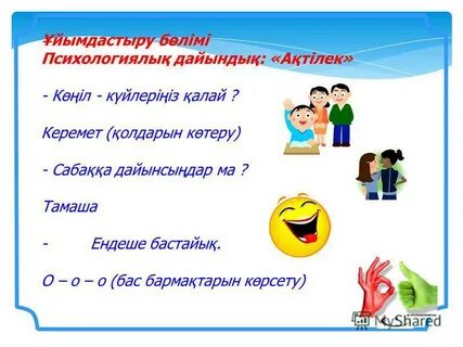 Сабаққа дайындық жасап, жақсы тілектер тілейді. Үй тапсырмасын пысықтайды Сөзжұмбақ шешеді Өлең мазмұнымен жұмыс жасайды Жеке жұмыс жасайды Ережемен танысады Жаттығу жасайды Тапсырманы орындайды Саралау тапсырмала рын орындайды Үй тапсырмасын алады Қосымша жұмыс жасайды Кері байланыс жасайды |