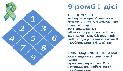 ҚБ 2- тапсырма. «Тоғыз гауһар» әдісі http://bookshelf.kz/index.php/catalog/audiobook/5149-olengderi_men_zhyrlary cайтындағы аудиокітаптан оқушылар Мұрат Мөңкеұлының «Сарыарқа» өлеңінің мазмұнын тыңдайды және негізгі түсініктер мен сөз, сөз тіркестерін анықтайды. Өлең табиғатын ашатын сөздер мен сөз тіркестерін қағазға жазады. Сыныптастарымен өлеңнің идеясы мен пафосының ұлттық мүдде тұрғысынан ашылуы туралы бірнеше пікірлерді оқып, оларды маңыздылық деңгейіне сай орналастырады. «9 гауҺар» әдісі.