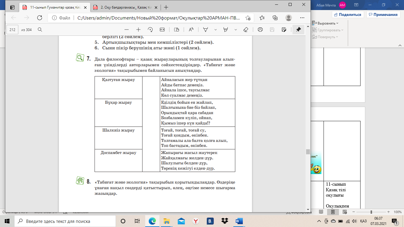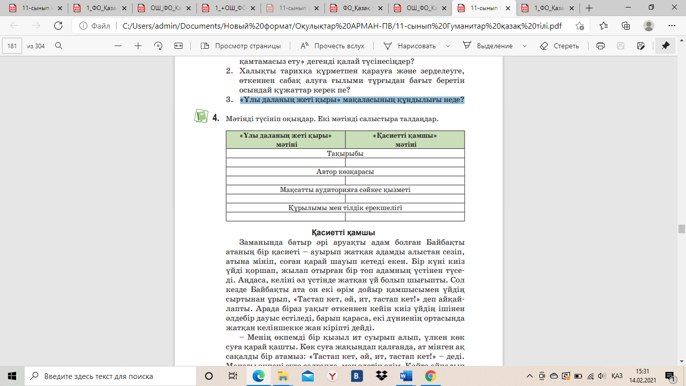 11.2.4.1 әртүрлі стильдегі (ғылыми, ресми іс-қағаздар, публицистикалық, ауызекі сөйлеу, көркем әдебиет стилі) мәтіндердің тақырыбын, автор көзқарасын, мақсатты аудиторияға сәйкес қызметін, құрылымын, тілдік ерекшелігін салыстыра талдау. 11.3.5.1 оқылым және тыңдалым материалдары бойынша түртіп жазудың (конспектілеудің) әртүрлі жолдарын меңгеру арқылы негізгі ақпаратты іріктеу. |