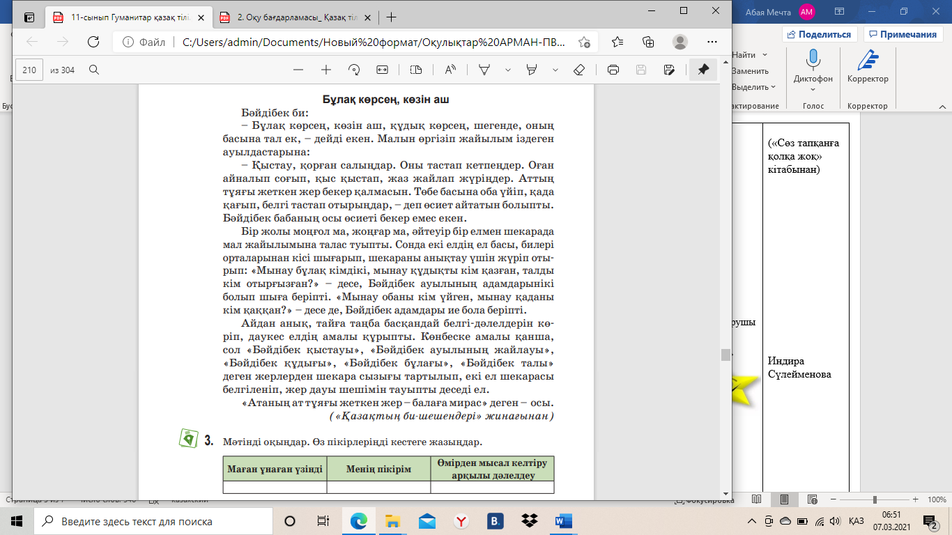Мәтінді оқыңдар. Сырымның тапқырлығы мен шешендігіне «Қосжазба күнделігі» әдісі арқылы баға беріңдер. Шешендік сөзді түсініп оқыңдар. Негізгі идеяны анықтаңдар. Мәтінді оқыңдар. Өз пікірлеріңді «Үш түрлі күнделік» кестесіне жазыңдар. Мәтіндегі үнаған үзіндіні анықтайды; Үзіндіге байланысты өз пікірін білдіреді; Өмірден мысал келтіру арқылы дәлелдейді. Мәтіннің тақырыбын анықтайды; автор көзқарасын көрсетеді; мәтіннің мақсатын көрсетеді; құрылымы мен тілдік ерекшелігін талдайды. |