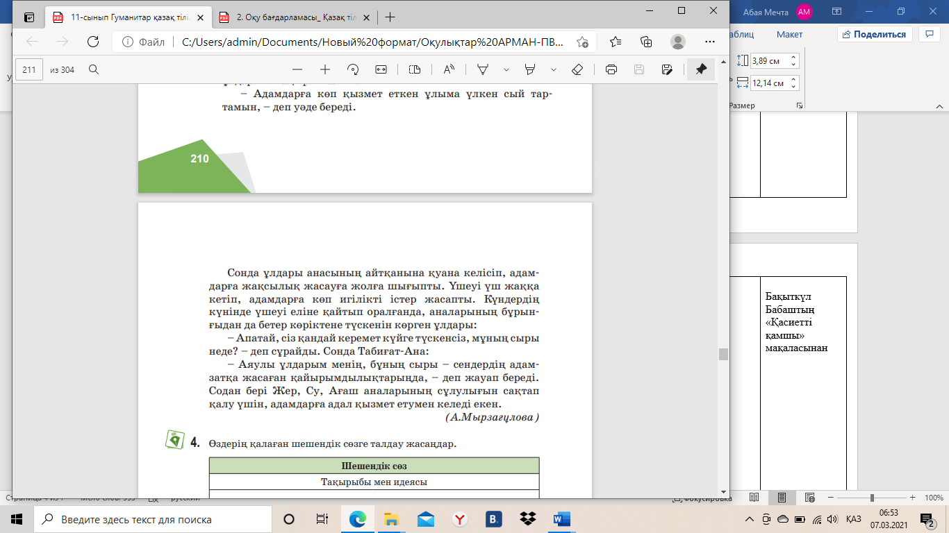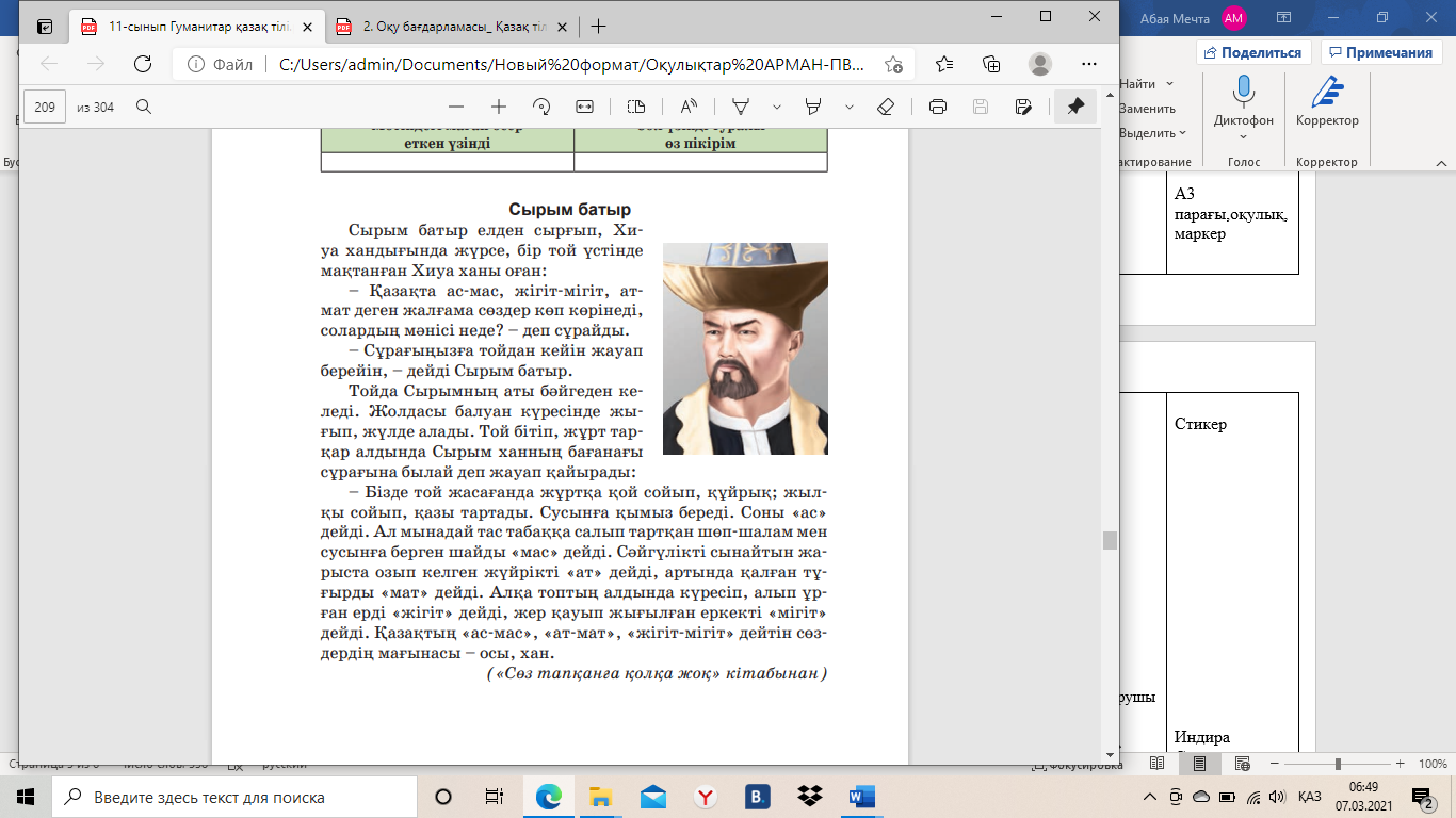 11-сынып Қазақ тілі оқулығы Оқулықпен жұмыс А3 парағы,оқулық, маркер («Сөз тапқанға қолқа жоқ» кітабынан) («Қазақтың би-шешендері» жинағынан) (А.Мырзағұлова) |