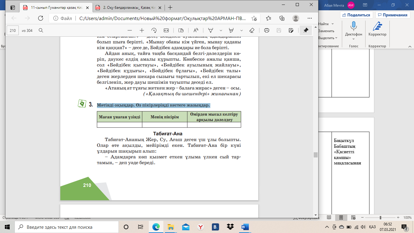 Тапсырма. Оқылым және тыңдалым материалдары бойынша түртіп жазудың (конспектілеудің) әртүрлі жолдарын меңгеру арқылы негізгі ақпаратты іріктеңдер. 1-топ. Екі мәтінді «Үш жақты күнделік» әдісі арқылы ойларыңды жазыңдар.