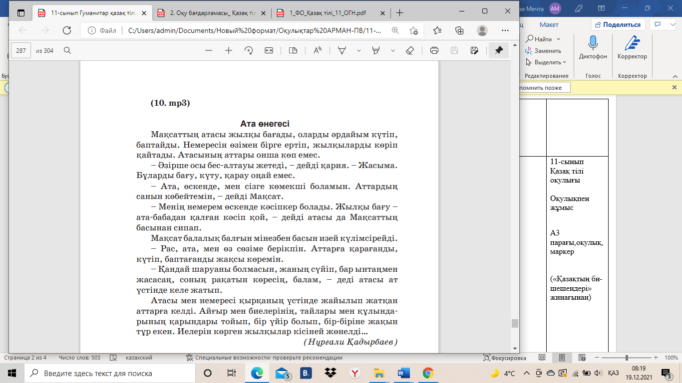 ІІ. ЖАЗЫЛЫМ ТАПСЫРМАСЫ. Мағынаны тану. Аудиожазбадан (10. mp3) «Ата өнегесі» әңгімесін тыңдаңдар. Мәтінде көтерілген мәселені, автор позициясын талдай отырып, негізгі ойды анықтаңдар. Өз отбасыңда атадан балаға қалған қандай дәстүр, кәсіп, өнер түрлері бар? (287-бет).
