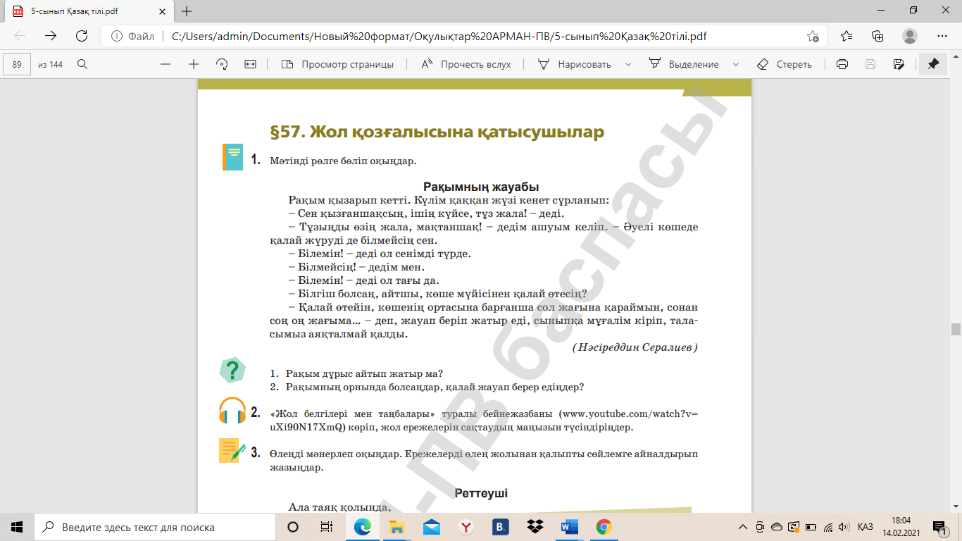 Тапсырма. Өлеңді мәнерлеп оқыңдар. Жол белгілерінің ережелерін мәтіннен анықтап, қара сөзге айналдырып жазыңдар. Дескриптор: