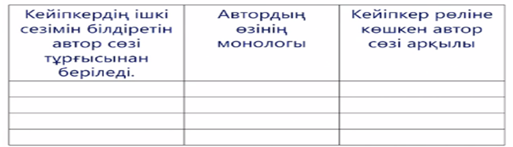 Берілген кестеге сәйкес көркем шығармадан үзінді алып, толтырыңыз. Автор бейнесі – әдеби шығармадағы жазушының өз тұлғасы. Оқиғалы шығармаларда автор негізінен алғанда оқиғаны баяндаушы болады.