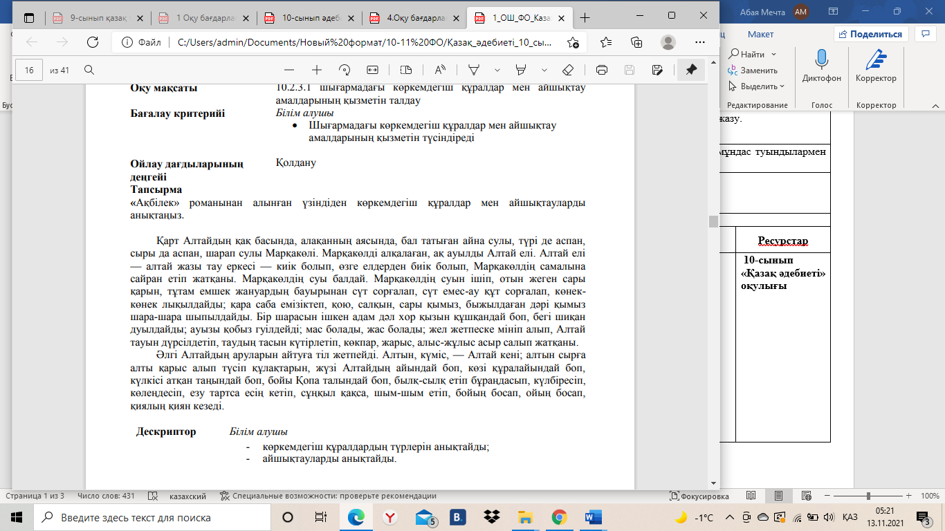 10.2.3.1 шығармадағы көркемдегіш құралдар мен айшықтау амалдарының қызметін талдау; 10.2.2.1 шығармадағы авторлық идеяның өмір шындығымен байланысын айқындау. |