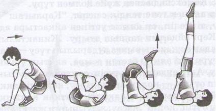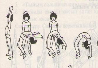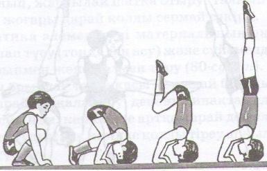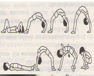 төсеніште жүресінен отырып алға,артқа домалау,жауырынға тік тұру. Әр топ берілген тапсырманы 5-6мин орындап мұғалімнің белгісі бойынша орын ауыстырып келесі жаттығуды орындайды.