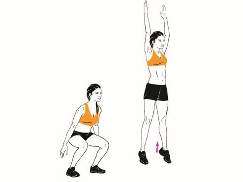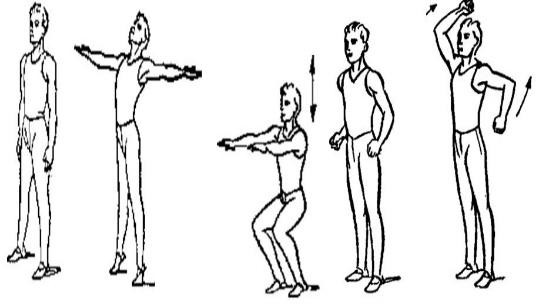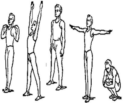жоғары,2оңға,3солға,4б.қ.5қолд ы алға соза жартылай отырамыз,6жоғары секіреміз.