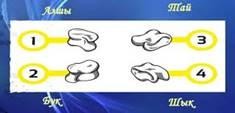 ажырату Тапсырма №5.Асықтың тұрысының атаулары: Алшы – асықтың тәйкеге қарама-қарсы жағы яғни алшы тұруы. Тәйке – асықтың алшыға қарама-қарсы жағы. Бүге – асықтың дөңес жағының жоғары қарап түсуі. Шіге – асықтың қуыс жағының жоғары қарап түсуі. Омпы – асықтың ашасы немесе мұртша жағы жоғары қарап түсуі немесе тік тұрып қалуы. Шоңқай – асықтың омпаға қарсы жағымен тік түсуі. |