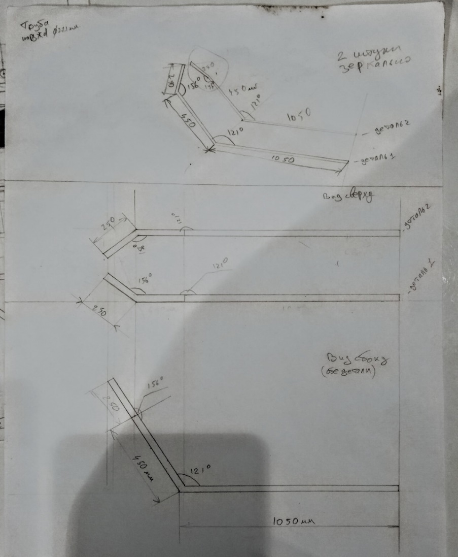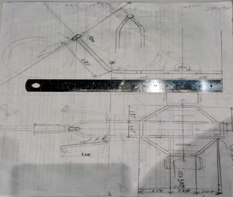 Жақтау. Ол трейктің жақтауын сериялық жақтаулардың суреттерінен жасады. Мен кімнің не салып жатқанын, төбенің артында не сатылатынын және бізде зауытта жасалғанын көрдім. Мен өзіме ұнайтын конфигурацияны шығардым. Мен бірден ұзын негізді қалаймын деп шештім, өйткені квадрат пішіні (база=осьтің ені) маған тұрақсыздық пен шамадан тыс айналу ұнамайды, шыңдарды өз осінің айналасында айналдыру маған қызық емес, егер дрейф болса, онда сіз бүйірден келе жатқаныңызды түсінуіңіз керек. Сонымен, ұзын база 1200мм, кең ось 900мм (калибр ~1000мм), осьтен кейінгі мотор, ортаңғы орындық, үлкен кастор (тігінен~40 градус), кең руль, велосипед жақтауларының бөліктері жоқ (өткен кезең, мұны істеу ыңғайсыз және онша көрінбейді) бұл Мен үшін қажет! Нәтижесінде есептеулерден кейін "сурет" салынды, оған сәйкес бәрі жасалды.