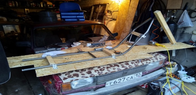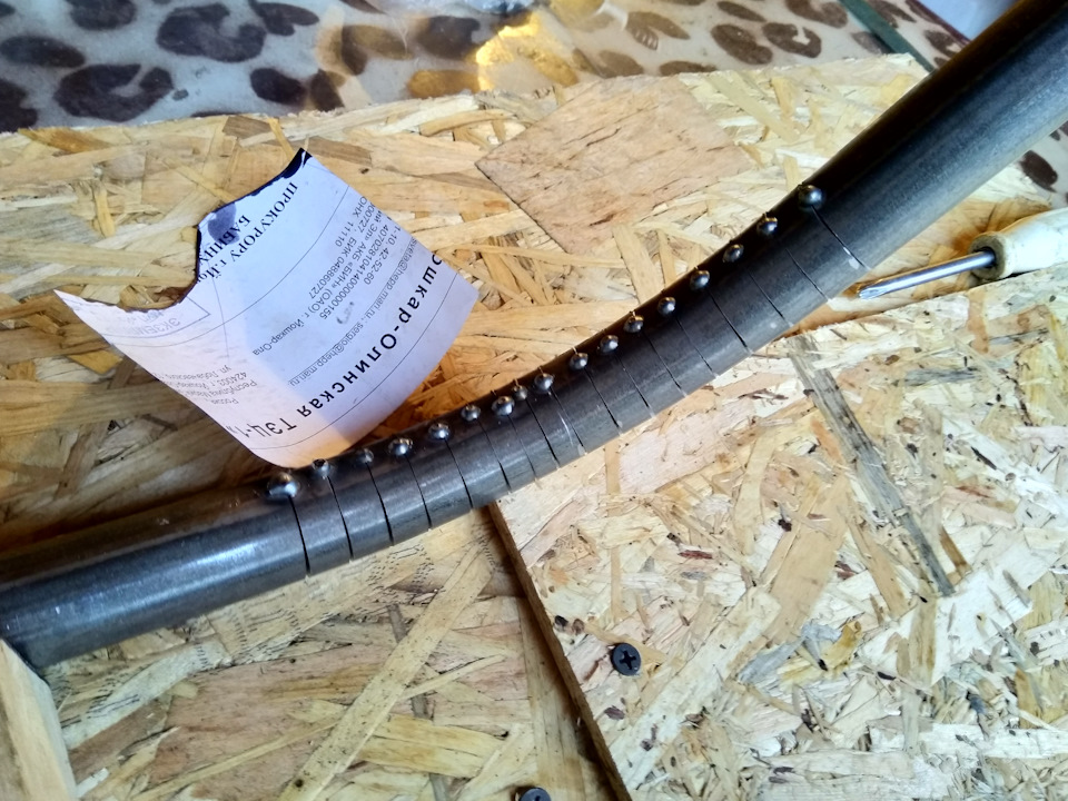 Дайындау. Құбырлар ұнтақтағышпен бүгілген. Мен үстелге бұралған кран түрінде кесуге арналған машина жасадым. Мен есептелген кесулерді кесіп тастадым, содан кейін ағаш шаблон бойынша қажетті бұрышқа бүгілдім. Мен дәнекерлеу нүктелерін қойып, тексердім.