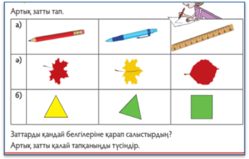 Дұрыс жауап слайдтан көрсетіледі: ескі - жаңа, кіші - үлкен Бағалау: жұптар бір-бірін басбармақ арқылы бағалайды. (Т) Оқылым Еркіннің хатын тыңдап , сұрағына жауап іздеңіздер. Сәлем , достар! Мен сендер сияқты 1-сыныпта оқимын.Аптаның бес күнінде мектепке барамын. Сенбі күні «Қызықты математика» үйірмесіне қатысамын. Жексенбі күні аулада футбол ойнаймын.Үйде досыммен шахмат ойнаймын. Мәтінді оқып беріп,әр топқа тапсырмалар беріледі. І топ: Сен неше күн оқисың? Күндерді ретімен орналастыр ІІ топ: Жексенбі күні не істейсің? Суреттермен постер жасау ІІІ топ: Сен қандай пәндерді оқисың? Суреттер арқылы орналастырады. Бағалау: "Бағдаршам" арқылы бағалау. Сергіту сәті: Ұ) Суретте бейнеленген заттардың әрқайсысын ата.Бұлардағы ортақ нәрсе не?