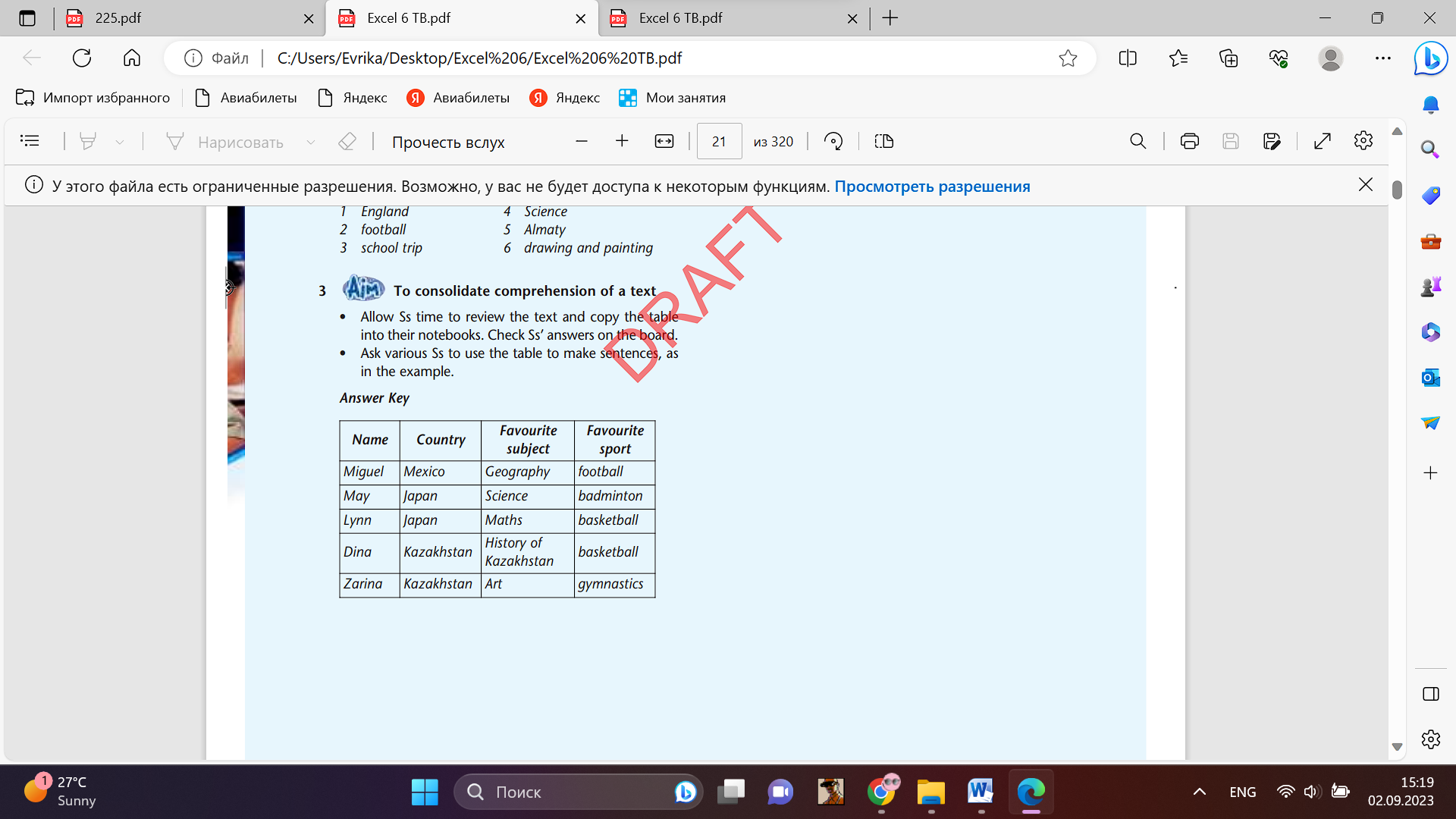Students listen to and read the text again. ANSWERS 1 England 2 football 3 school trip 4 Science 5 Almaty 6 drawing and painting Learners answers Yes or No in CCQ ANSWERS - Yes - No - No - Yes |