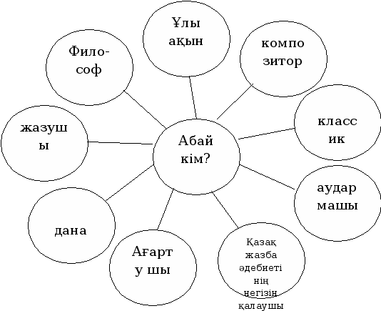 1-оқушы:Абай- ұлы ақын, Абай –дана, ойшыл, замана суреткері.Абай-аудармашы.Абай- сазгер, композитор.Абайдың шын аты-Ибраһим.