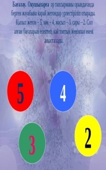Талқылау кезінде оқушылардың айтылған пікірлері мен көзқарастары ауызша мадақтау арқылы бағаланып, сабақтың келесі кезеңінде белсенді қатысуына ынталандырады Жарайсың!