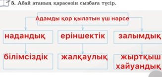 4-тапсырма. Абай атаның сөзі неліктен осы бөлімде берілген деп ойлайсың? Түсіндіріп көр 5-тапсырма. Абай атаның қарасөзін сызбаға түсір