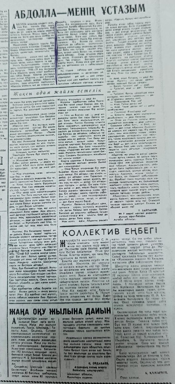 Ақын туралы 1965 жылы жарияланған Қазақстан мұғалімі газетінің №35санында жарияланған деректерге қарағанда ақынның мұғалім болып қызмет атқарғанын да білуге болады. Бұл мақалада Т. Байтауовтың, Қ. Қажымовтың, Қ. Ордабаевтың ақын жайлы естеліктерін көруге болады[2].