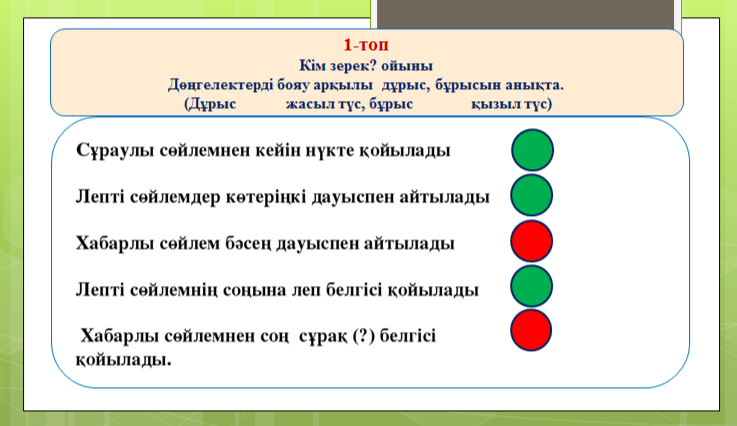 Ынтымақтастық атмосферасын және өздеріне сенімділік қалыптастыру ширату жаттығулары арқылы жүреді. - Мен ғажаппын. -Мен кереметпін. - Менің күш-жігерім көп. -Менің денсаулығым мықты. - Мен өмірді сүйемін. - Мен тамаша жанмын. - Мен мейірімді адаммын. - Мен сабырлымын, салмақтымын. - Менің қолымнан бәрі келеді. - Мен үшін өмір қызықты. - Мен бәріне ризамын. - Мен бақытты адаммын. -Мен білімді боламын. -Менің достарым көп. -Менің достарым адал балалар. -Менің сыныптастарым керемет. Ебқ қатысады Топқа бөлу «Оюлар» 1 топ қызыл оюлар 2 топ сары оюлар 3 топ жасыл оюлар Өткен сабаққа шолу, жаңа сабаққа кіріспе: А)Үй тапсырмасын тексеру. Ә) «Керме жіп» әдісі: -Балалар, кезекпен парақтағы сұрақтарды алып , жауап береді. -Хабарлы сөйлемнің анықтамасын айтыңдар. -Сөйлем нені білдіреді? -Сөйлемнің түрлерін ата? -Сұраулы сөйлемнің анықтамасын айтыңдар. -Олай болса, бүгінгі сабағымыз да сұраулы сөйлемді ажыратуға арналады. Сабақ мақсатын хабарлау. |