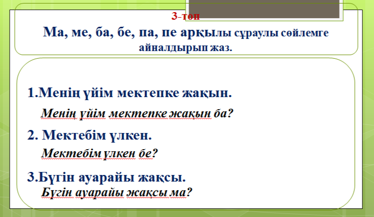ЕБҚ қатысады. Топтық жұмыс. 1топ Кім зерек? ойыны 2 топ Семантикалық картаны толтыр. 3топ Ма, ме, ба, бе, па, пе арқылы сұраулы сөйлемге айналдырып жаз. |