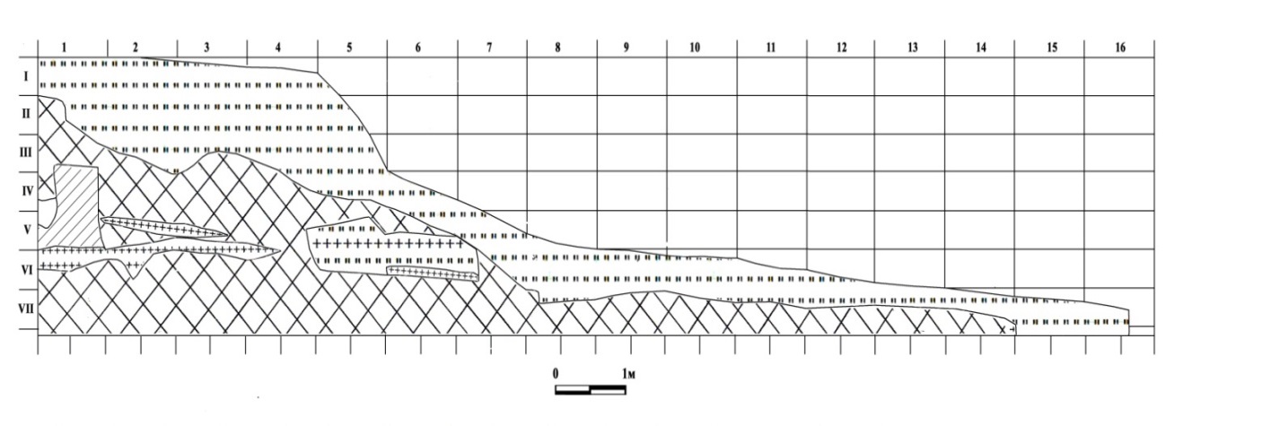Қазба 1. Цитадельдің солтүстік-батыс бөлігінен ені-6 м., ұзындығы 10 м., белгіленіп, тереңдігі- 2,30 м. көлемде тазаланып аршылды (3-4 суреттер). Бұл қазба 1 кешені солтүстік-шығыстан оңтүстікке қарай бағытталып жатыр (5-сурет). Қазба 1-дің солтүстік-шығысындағы қазба жиегі 1-кесікпен жанасып жатыр, арасында ені-1 м., болатын кесіндісі бар. Осы қазба 1 кешенінің солтүстік-батыс бөлігі цитадельдегі су шайып қатты бұзылған жарғабақпен жанасып жатыр.