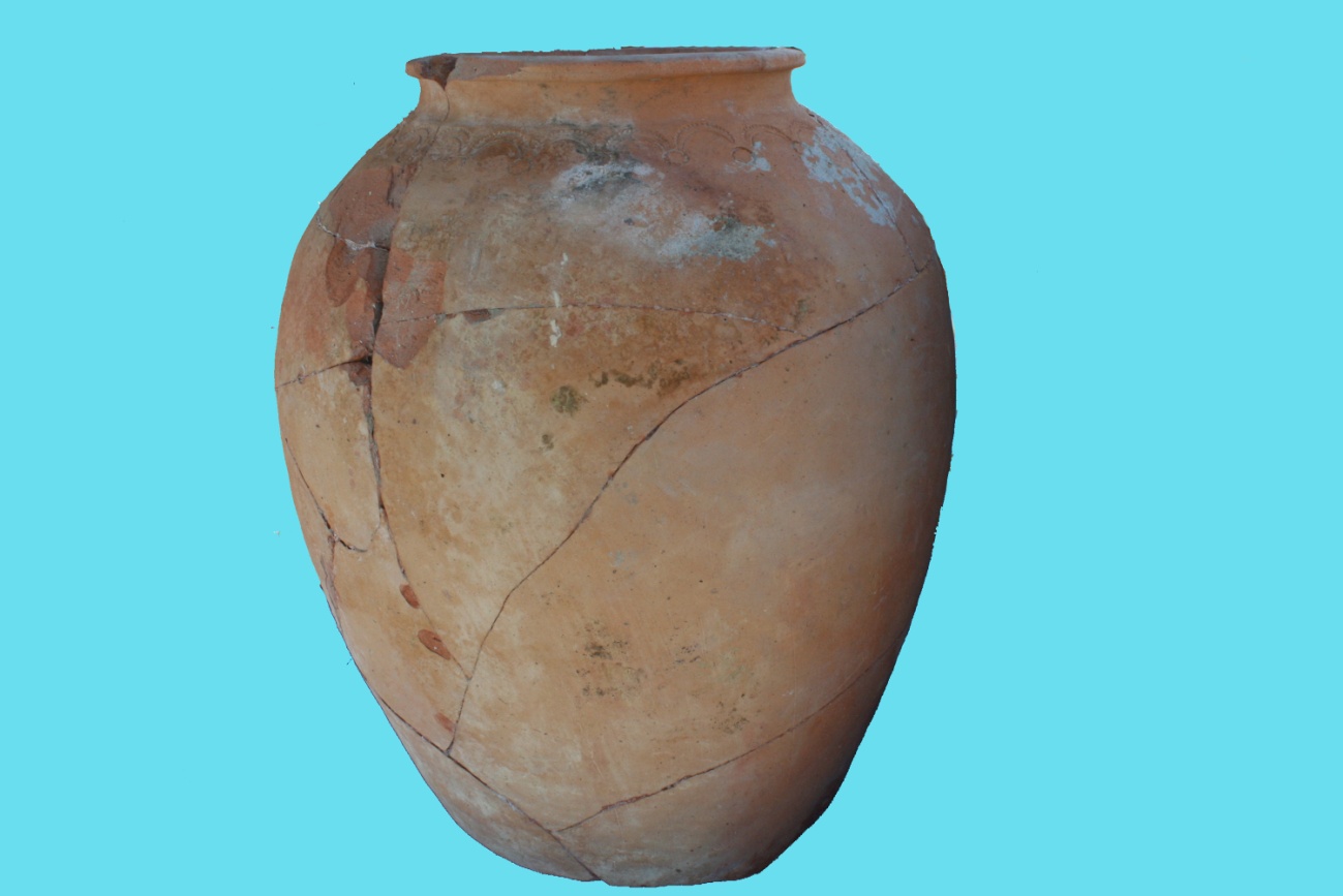 18. Тұтқалы құм. Қақпақ жабуға арналған құмның ернеуіндегі аумағы 25 см, оның үсті сәл доғалдау болып келген, алаңының ені 4 см. Құмның бүйіріндегі (ең шығыңқы жері) аумағы 75 см, түбіндегі аумағы 33 см, биіктігі 91 см. Құмның сыртқа қайырыған жиегінде саусақпен батырып салынған өрнек бар. Құмның сыртында иегінен 3 см төмен ілгек тәрізді тұтқасы бар, оның төменгі жағы ыдыстың иығына жапсырылған. Тұтқаның ені 6 см, қалыңдығы 1,5 см, ортасында саусақпен батырып салынған із сақталған.