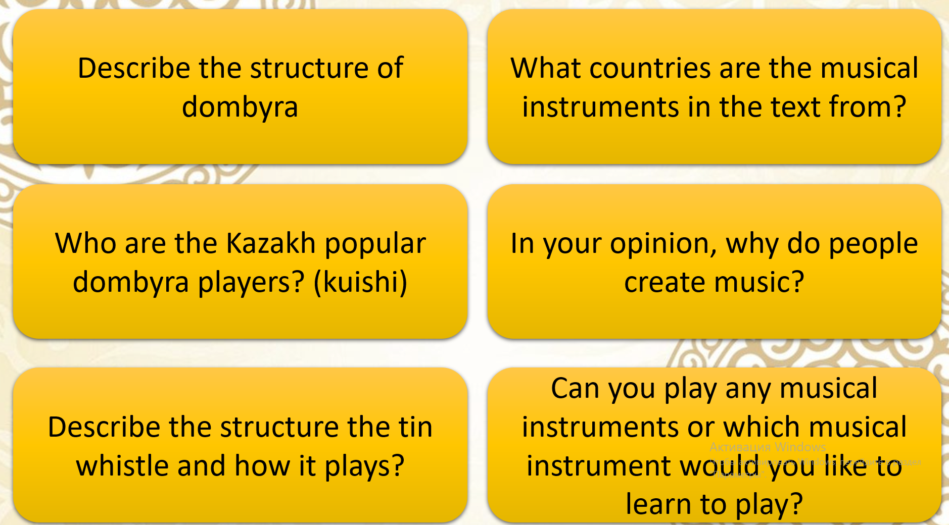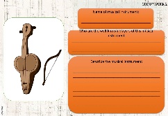 Pupils watch the video Pupils name some musical instruments. List them under the headings. ANSWERS wind: trumpet, trombone, recorder, oboe, clarinet, bassoon string: violin, cello, viola, double bass, guitar percussion: piano, drums, cymbals, tambourine, bells, triangle This is a drum. It is a percussion instrument. • Pupils listen and read to find out. Answer the questions Pupils write some information about dombra and tin whistle The dombra is a string instrument and the tin whistle is a wind instrument. The dombra is from Kazakhstan and the tin whistle is from Ireland. They are still played nowadays The dombra is a string instrument from Kazakhstan. The tin whistle is a wind instrument from Ireland. Some bands use electric dombras. The theme tune from the film 'Titanic' had a tin whistle in it. Pupils listen to some instruments music and find what instrument it is