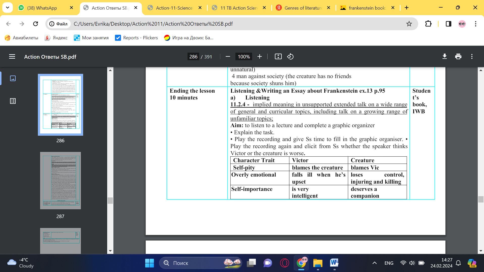 Ex:13 P: 95 Explain the task. • Play the recording and give Ss time to fill in the graphic organiser. •Play the recording again and elicit from Ss whether the speaker thinks Victor or the creature is worse. Ex: 14 P: 95 • Go through the theory with the Ss. • Give Ss time to look up the plot of each of the novels mentioned in the theory box . Alternatively, explain the plots in class. • Give Ss time to match the types of conflict in the theory to the situations (1-4) from Frankenstein. • Check Ss’ answers around the class. Ask Ss to justify their answers Ex: 15 P: 95 Ask Ss to read the novel Frankenstein at home. Direct them to for an online version. In a future lesson after Ss have read the book, ask Ss to answer the questions to test their knowledge. Alternatively, have Ss guess the answers to the questions and then read the book and correct their guesses at a future time. If it is not feasible to read the book, have Ss read a plot summary of the book on Wikipedia or a similar website and then complete the quiz. Conclusion during the lesson some tasks differentiated by outcomes of the students and by their abilities. |